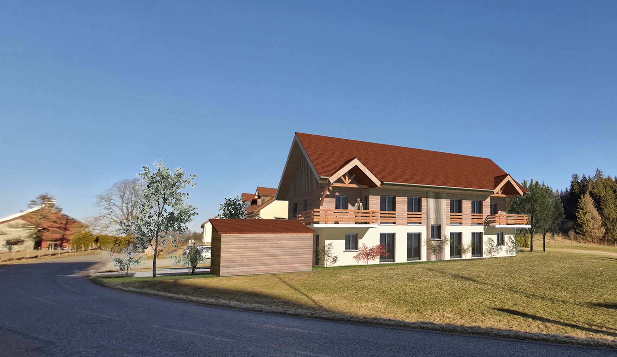 Près de Saint Laurent en Grand Vaux, petit bâtiment d’habitation de quatre logements réalisés avec un ravalement beige clair au RDC et un bardage bois pour l’étage. Les garde-corps des balcons et fenêtres de l’étage sont en bois. Les menuiseries sont en aluminium, d’un ton gris anthracite. La toiture est traitée en tuile de terre cuite. Le garage est traité avec un bardage en bois.